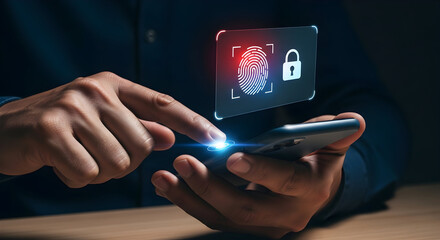 Person authenticating smartphone access with fingerprint scan, futuristic technology interface showing security and data protection, biometric verification concept.