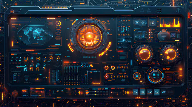 Futuristic holographic hud featuring circular control interface, world map and data streams