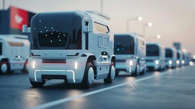 Futuristic autonomous trucks driving on a road at dawn, showcasing a glimpse into the future of transportation.