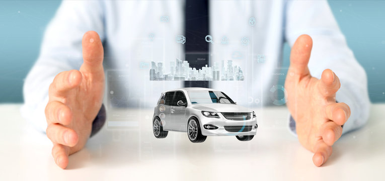 Cyborg hand holding Dashboard smartcar interface with multimedia icon and city map on a background 3d rendering