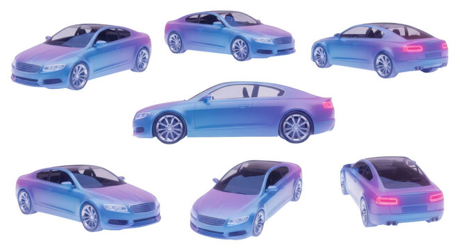 Several blue gradient coupe cars showcasing different angles isolated on a white background for automobile design or advertising use