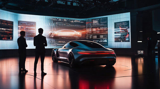Two people observing an advanced car presentation with futuristic displays and a sleek vehicle in focus.