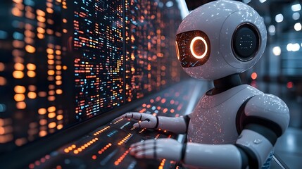 Woman analyzing digital data on screen, technology and innovation focus, modern business concept