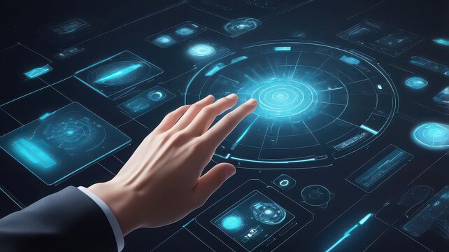 Hand interacting with futuristic holographic interface displaying complex data visuals and information