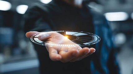 Digital holographic screen displaying world map with data analytics and glowing light beam