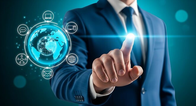 Businessman touching digital world map with glowing network nodes futuristic global technology communication innovation virtual connection interface concept