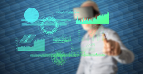 Male wearing virtual reality headset touching interactive interface