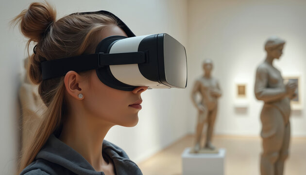 Woman uses virtual reality headset at art show. Female explores museum with vr goggles. Girl experiences futuristic tech, visual display. Innovative digital interface allows immersive art discovery