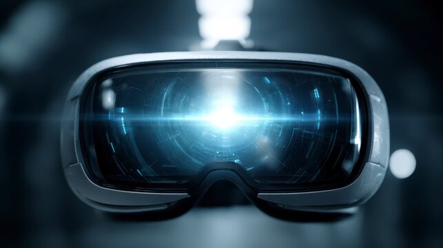 VR Headset: A close-up shot of a sleek virtual reality headset, glowing with futuristic light and technological innovation, is ready to transport the viewer to another world.