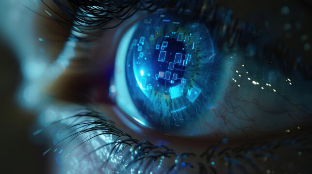 image showcases close up of eye with digital interface reflected in iris, symbolizing technology and vision. intricate details evoke sense of innovation and futuristic concepts