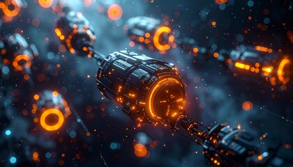 Glowing nanospheres with spiked surfaces connect via radiant lines in a dark digital matrix.