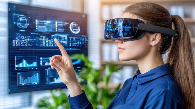 A woman with virtual reality goggles interacts with digital data visualizations in an office environment.
