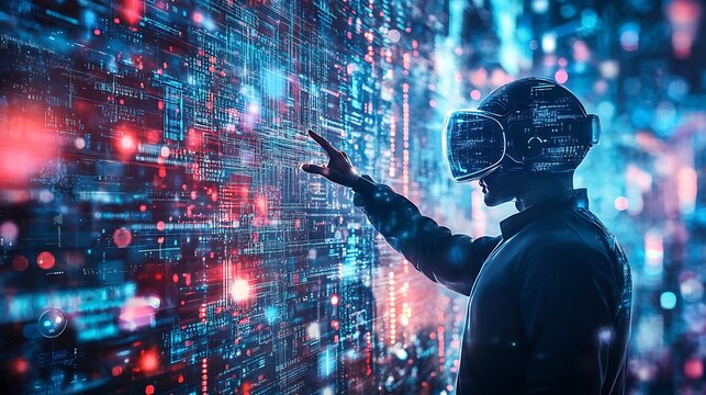 Man Wearing Futuristic Virtual Reality Headset Experiencing Advanced Digital Technology