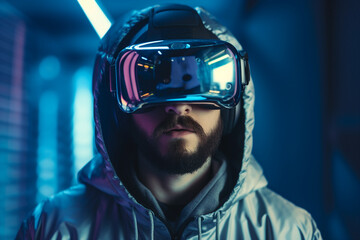 Generative Ai person using Virtual reality goggles 3d augmented experience exited digital world headset