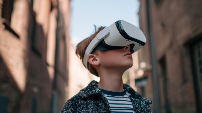 europe boy in white augmented virtual reality glasses in street , with copy space