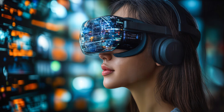 A close-up of a person wearing a virtual reality headset, with a futuristic digital interface overlaying their vision