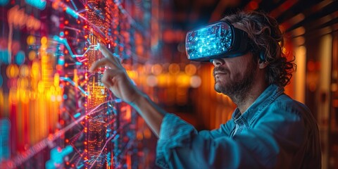 Man wearing virtual reality headset interacting with a holographic digital interface surrounded by vibrant neon lights