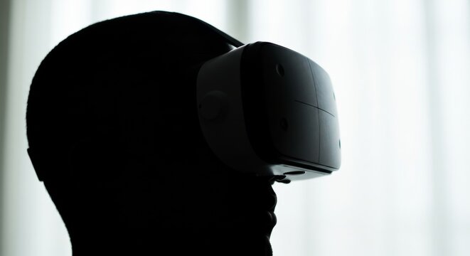 Silhouette of a person wearing a Virtual Reality headset against a bright background
