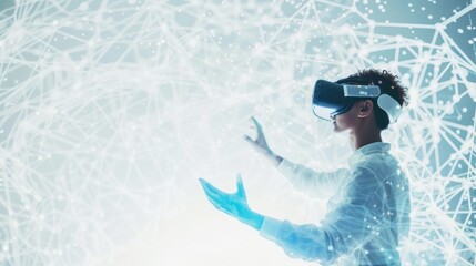 Woman using virtual reality headset for gaming and metaverse experience in digital futuristic world
