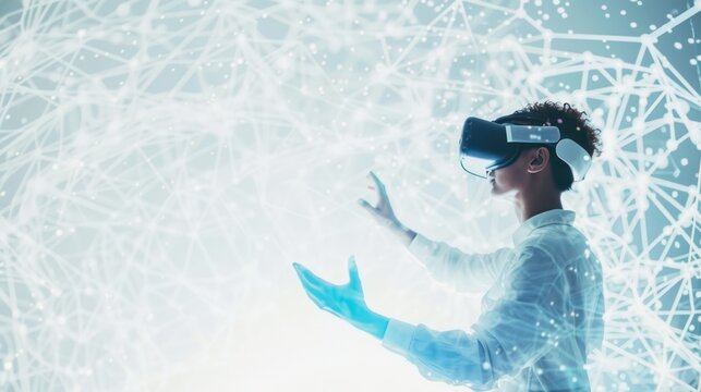 Man in VR Headset Reaching Forward, Immersive Virtual Reality Experience, Futuristic Technology 3D
