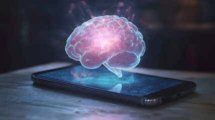 Glowing holographic brain floats above smartphone, symbolizing advanced technology and innovation. scene conveys futuristic and digital atmosphere, highlighting integration of AI