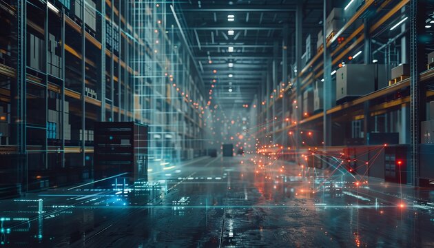 Futuristic warehouse technology with digital interfaces