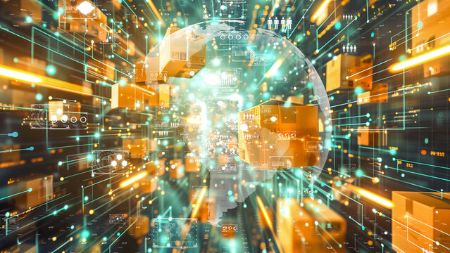 Warehouse shelves filled with boxes and digital overlay representing inventory management, logistics optimization, and supply chain technology in modern storage facility.