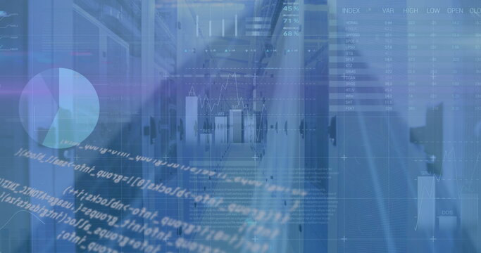 Displaying dashboard showing blue bars and red trends on digital display, with green hex icons