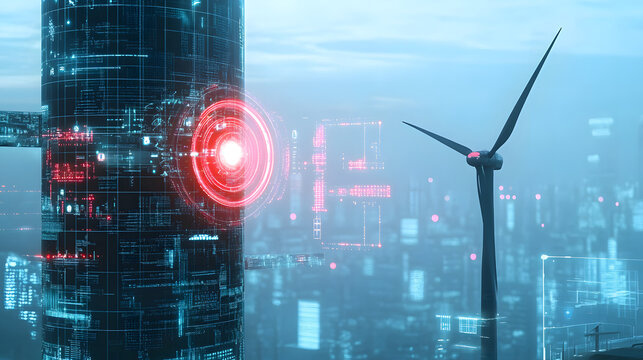 Futuristic wind turbine with digital technology overlay