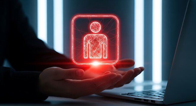 Emerging wireframe human head on blue grid interface, with user silhouette icons and circuit lines