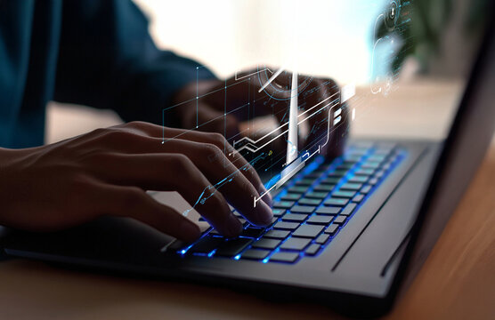 Close-up View of Hands Typing on Laptop Keyboard with Digital Overlay of Technology Graphics and Data Analysis Concepts