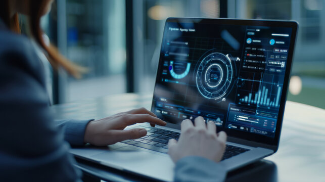 A person working on a high-tech laptop displaying futuristic data and analytics in a sleek, tech-focused environment.