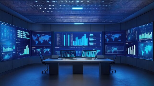 High-tech digital workspace with multiple screens displaying real-time data analytics.
