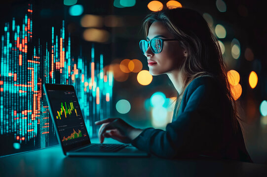 Businesswoman analyzing digital financial data on computer monitor