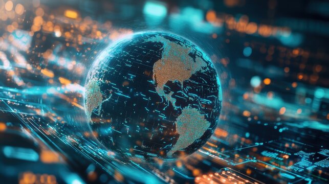 Globe, digital world and interconnected networks representing global communication and technology advancements. Data transfer, cybersecurity, and innovation concepts.