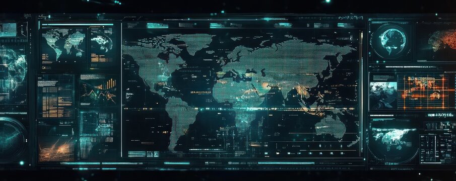 A futuristic heads-up display with a world map and various data visualizations. Ideal for sci-fi interfaces, cybersecurity dashboards, or data analysis tools.