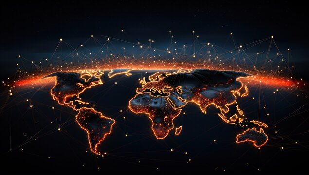 Futuristic digital world map with illuminated data points and technological elements representing global connectivity and information flow.