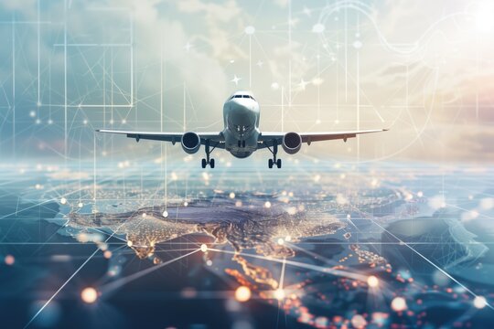 Airplane flying over a cityscape with digital network overlay and futuristic design elements. Concepts of global connectivity, technology, and modern travel.