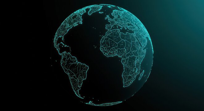 a digital world map with a glowing network overlay, representing global communication, international business connectivity, and modern technology in a digital age