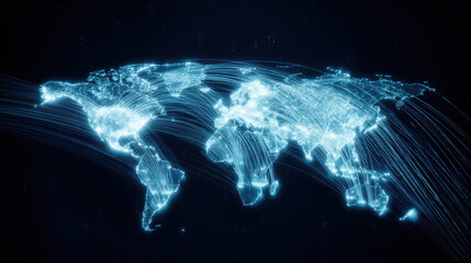 Glowing data stream forming a digital world map, illustrating global connectivity, international communication, and abstract technology concepts with vibrant lines and dots
