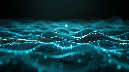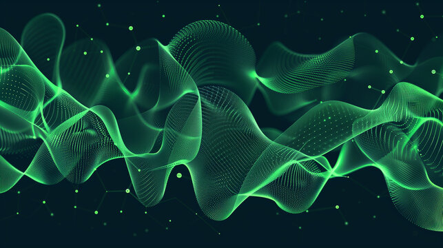 Abstract green wave pattern with dynamic motion particles on dark background