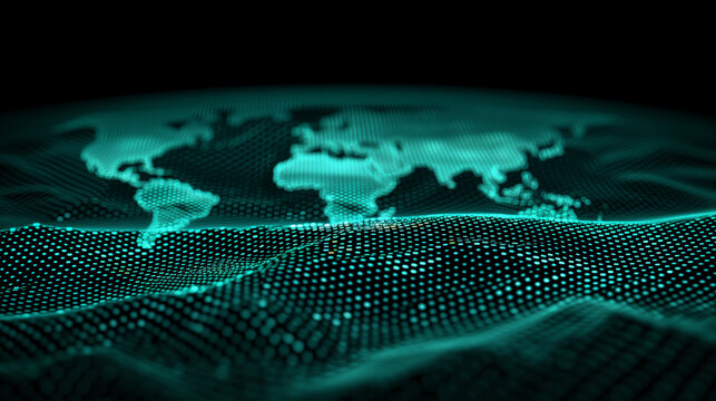 Cyan particle cloud forming digital waves over halftone world map with code overlay