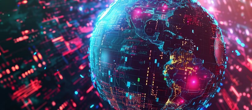 Holographic cloud streaming neon data across 3d world map with circuitry