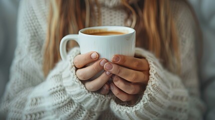 Close-up of a woman's hands holding a white mug of coffee while wearing a white sweater