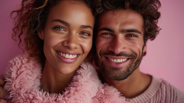 Smiling couple portrait, light-skinned woman and man. Pink background. Fuzzy sweater