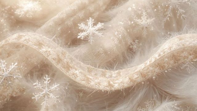Beige fuzzy knit cable draping over fur with sparkling snowflakes and glitter macro