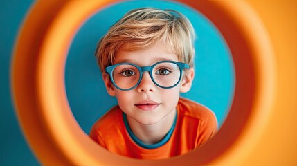 Child wearing glasses through a focal circle (e.g., through a tube or ring)