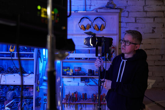 caucasian gaffer professional lighting set up lighting on set
