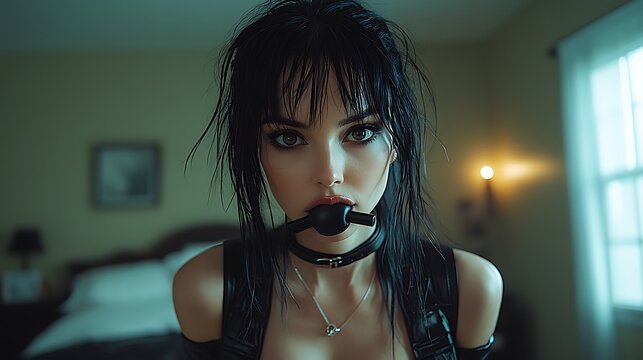 Young woman with straight black hair in a high ponytail, intense dark eyes with heavy makeup, and a black leather gag in her mouth, standing in a modern IKEA-style bedroom