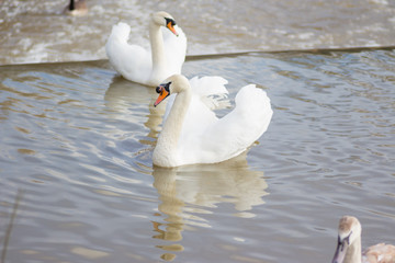 Flock of white domestic geese on the pasture. Big white goose in meadow. Domestic geese on the green lawn